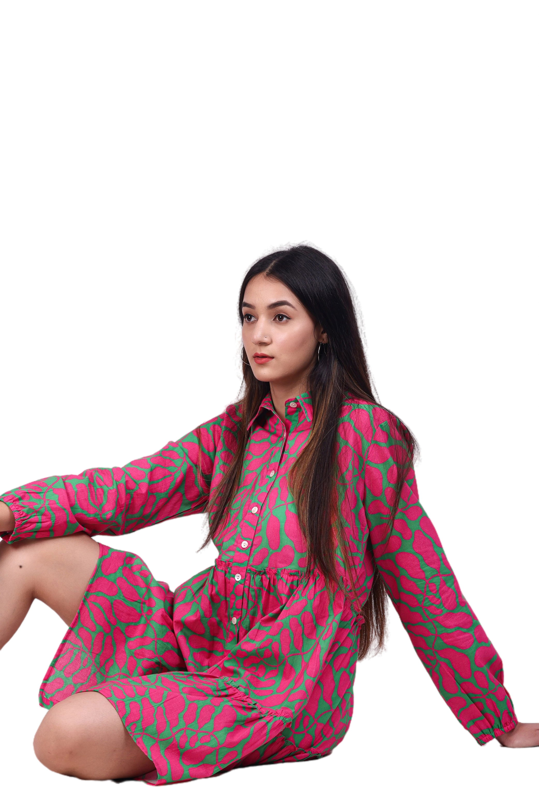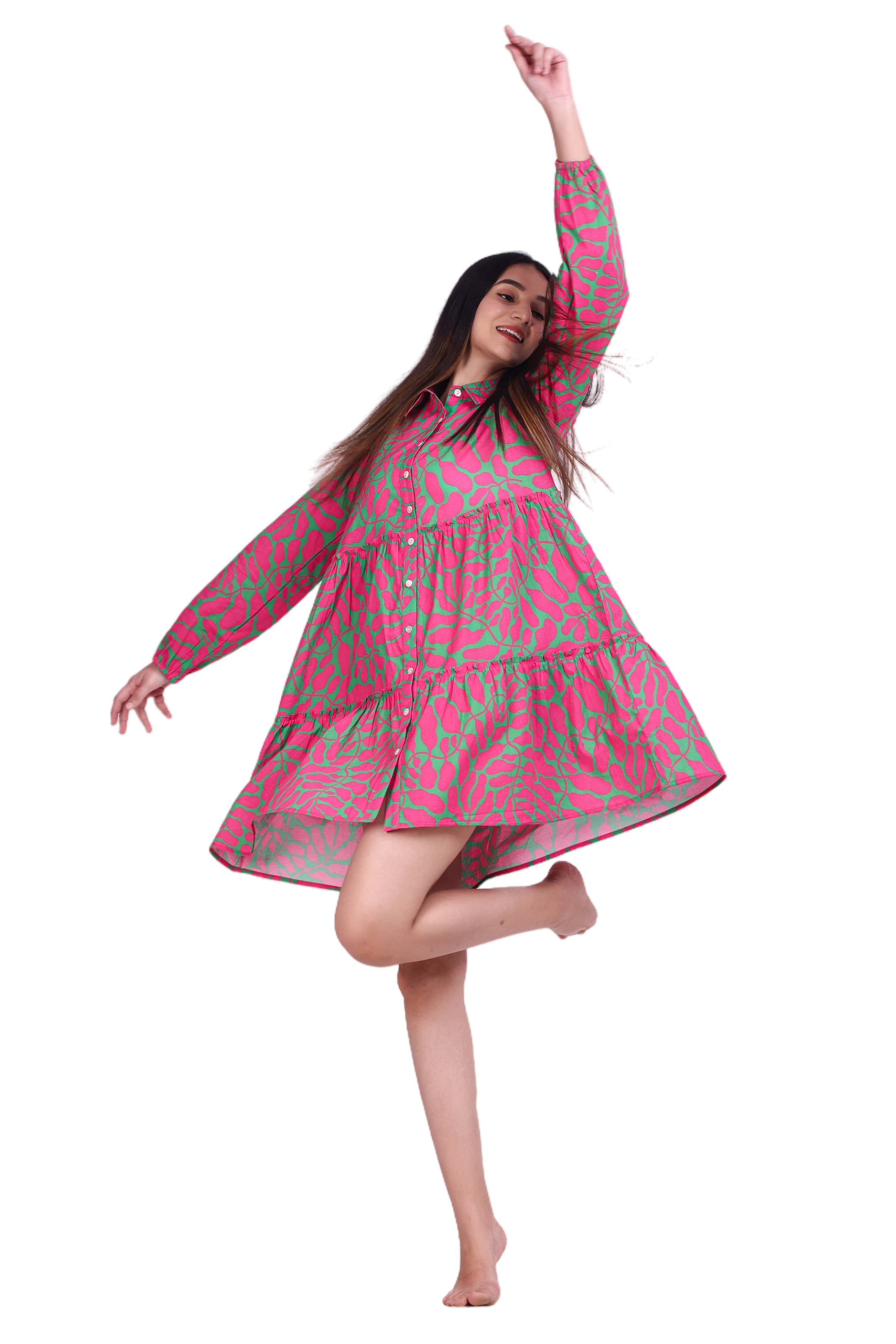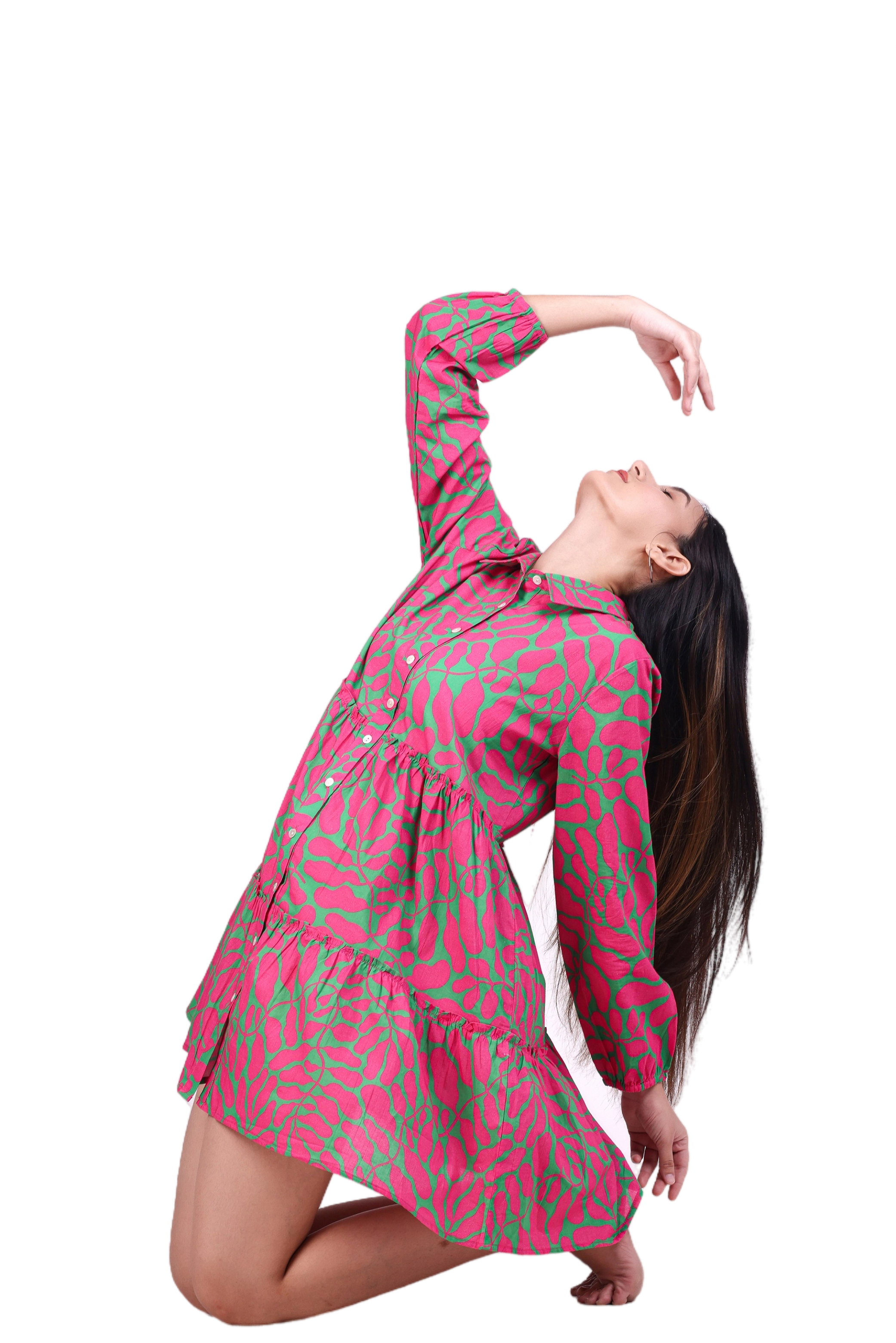 Elevate your wardrobe with the G-Class Vibrant Pink and Green Patterned long sleeve Dress. This stylish dress features a bold, eye-catching pattern with a comfortable, relaxed fit. Perfect for any occasion, this dress is available in sizes, S, M, L, XL, XXL. Its button-down front and tiered skirt add a trendy touch, making it a must-have for fashion-forward individuals.