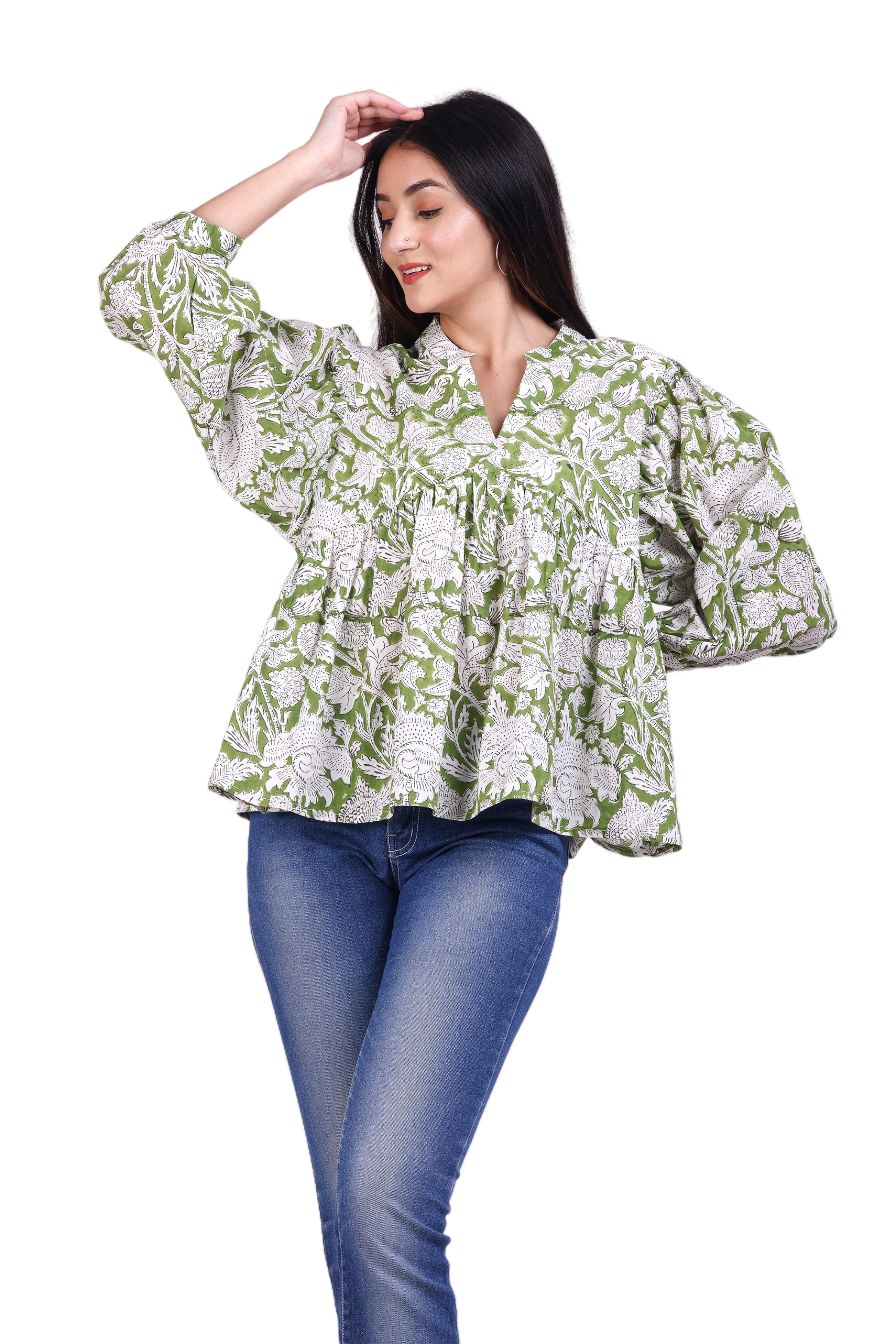 Blouse. This chic blouse features a charming floral design that adds a touch of elegance to any outfit. Made from high-quality fabric, it ensures comfort and durability. Perfect for casual outings or dressed-up events, this versatile blouse is available in sizes S, M, L, XL, and XXL, ensuring a great fit for everyone.