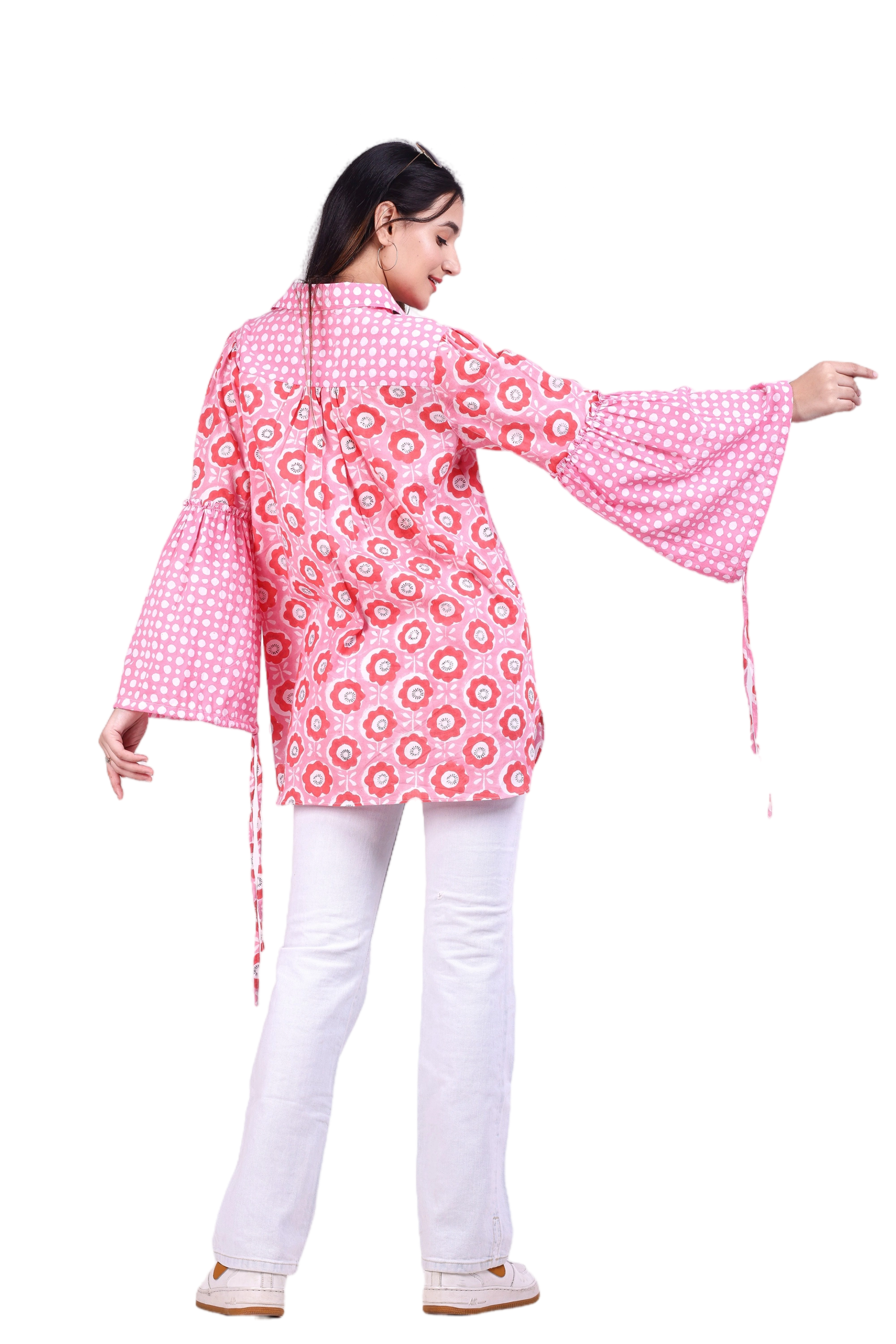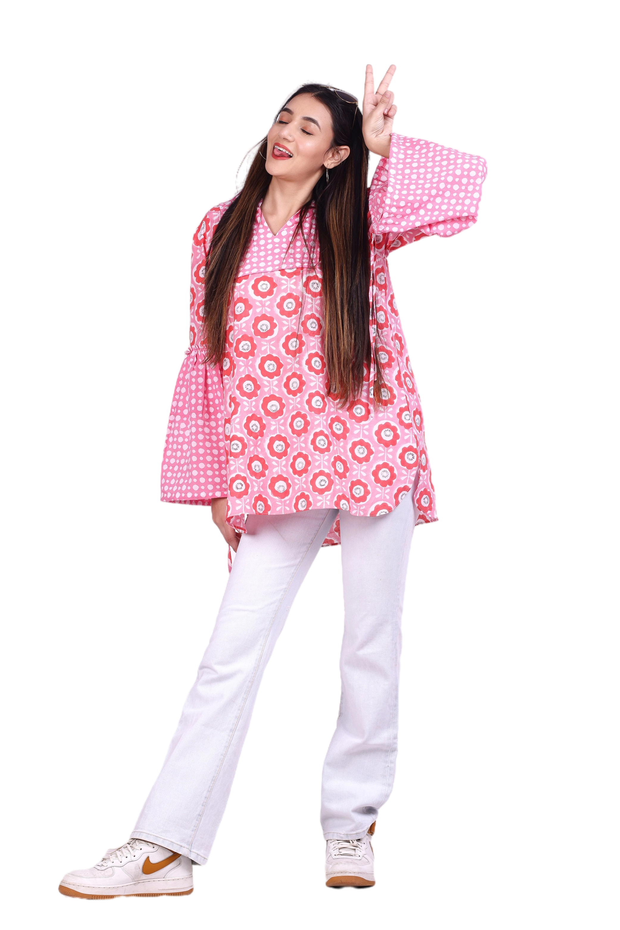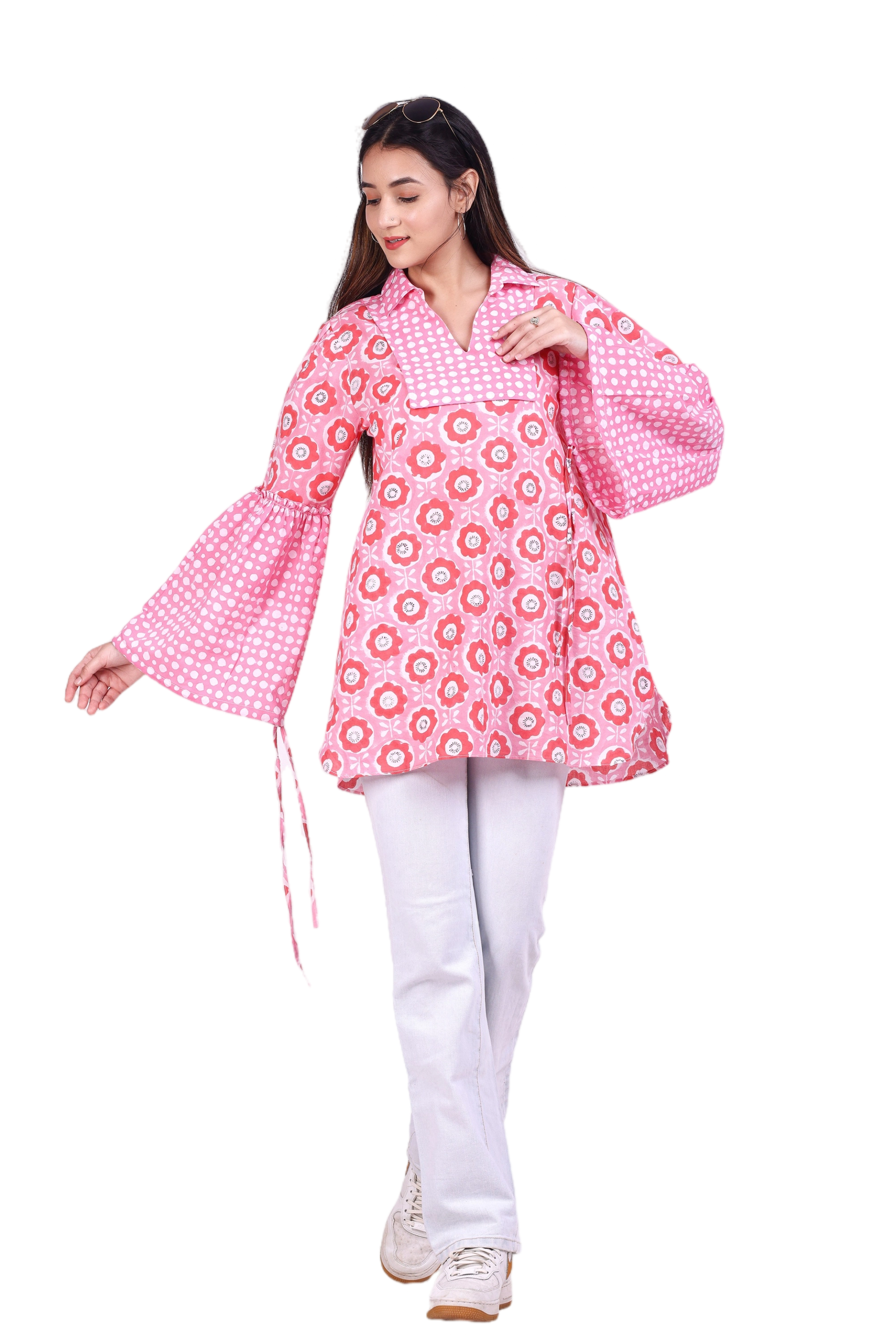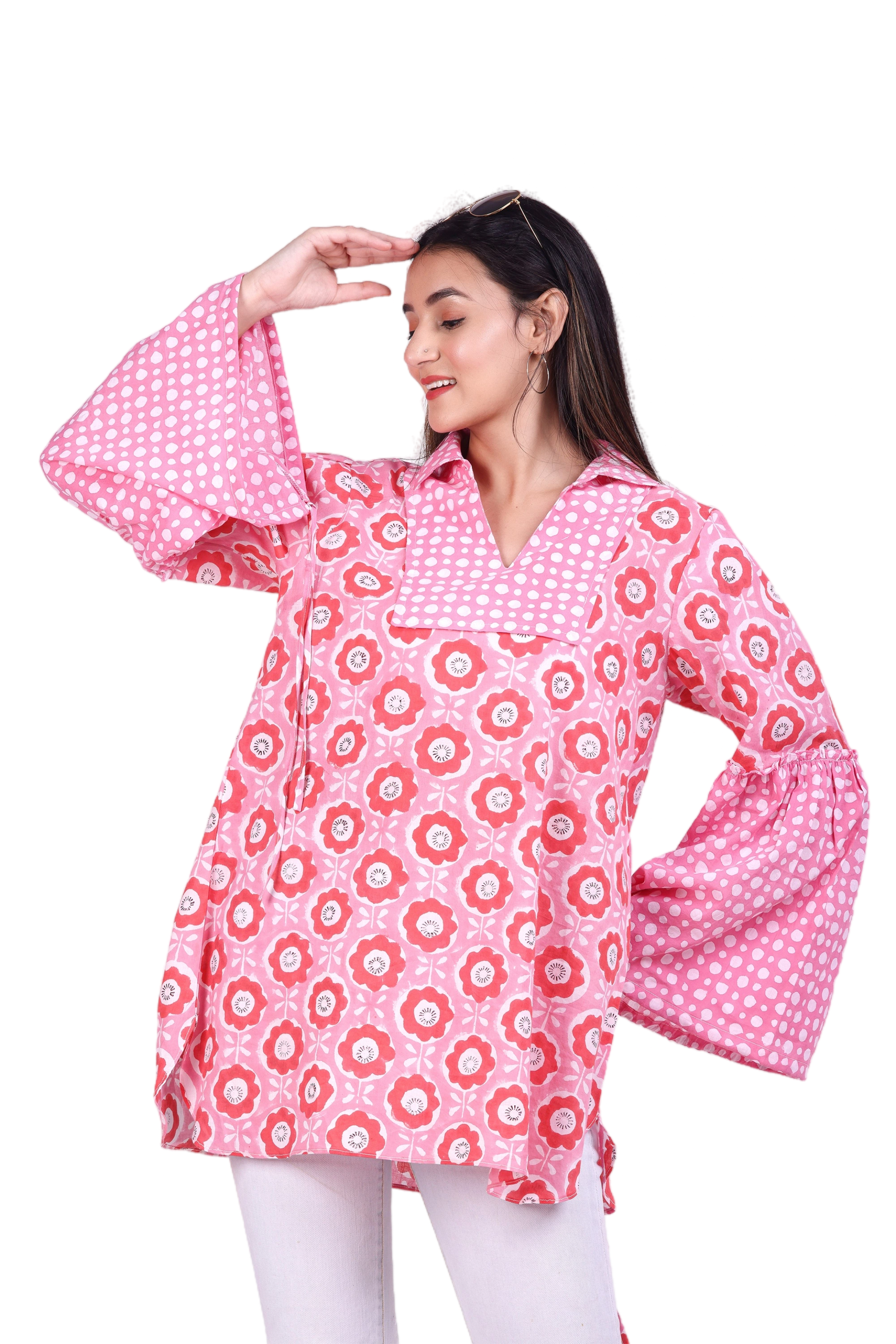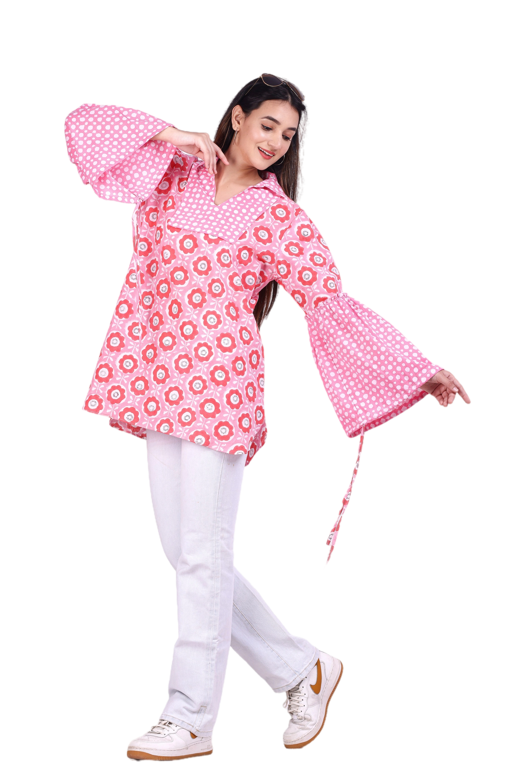 This chic and comfortable top features a vibrant pink hue with a playful floral design, perfect for any occasion. The lightweight fabric ensures all-day comfort, while the flowy fit and flared sleeves add a touch of elegance.